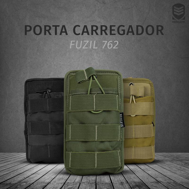 Confeccionada em rip stop com duas camadas de resina, E.V.A e fitas de poliamida proporcionando uma alta qualidade e resistência. Possui sistema de regulagem para cinto tático e colete modular. Especifico para carregador 762.